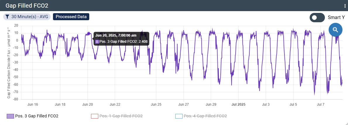 After sensor and weather data have been scrubbed, filtered, preliminarily gap-filled, and despiked the dataset is prepared for data imputation. The data is processed by the Marginal Distribution Sampling (MDS) algorithm that uses like data from recent and near-future measurements in temperature, Vapor-pressure deficit (VPD), and solar radiation to impute the data [5]. This creates a continuous set of flux data that can be used for future processing such as flux accumulation, forecasting, and spatial extrapolation.
