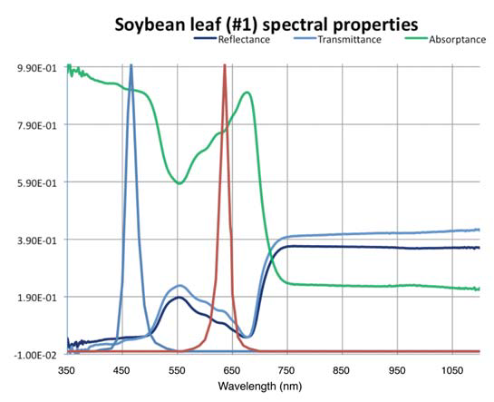 Figure 1‑2 shows a plot of the spectral reflectance, transmittance and absorptance of a pale young Soybean leaf between 300 and 1100 nm. The measurements were taken using an LI-1800 Spectroradiometer and an 1800-12S External Integrating Sphere (LI-COR, Inc.). The reflectance, transmittance, and absorptance measurements were taken with the upper surface of the leaf facing the integrating sphere light source. Also shown in Figure 1‑2 are the relative spectral outputs of the red and blue LEDs used in the 6400-40 Fluorometer. Total leaf absorptance was determined by integrating over the wavelength range of the blue and red LEDs and normalizing for their spectral output (see Table 1‑1).