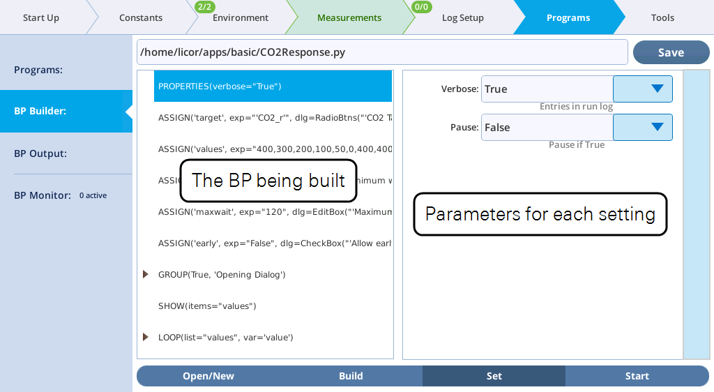 The BP environment has five tabs along the bottom: Open/New, Build, Set, Start, and Monitor.