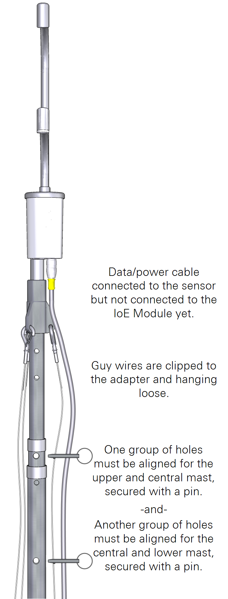 Figure 2‑1. The adapter threads onto the mast. Rotate the mast so one guy wire extends the direction opposite the enclosure door and the other two extend to the sides. -