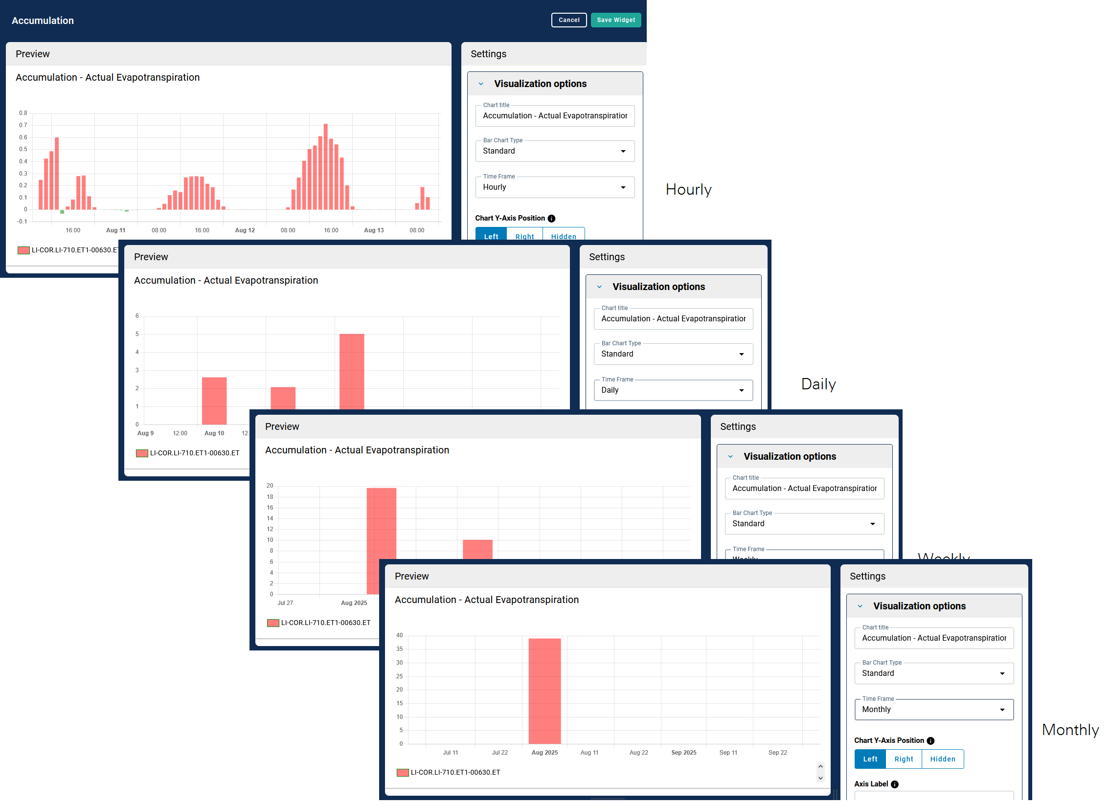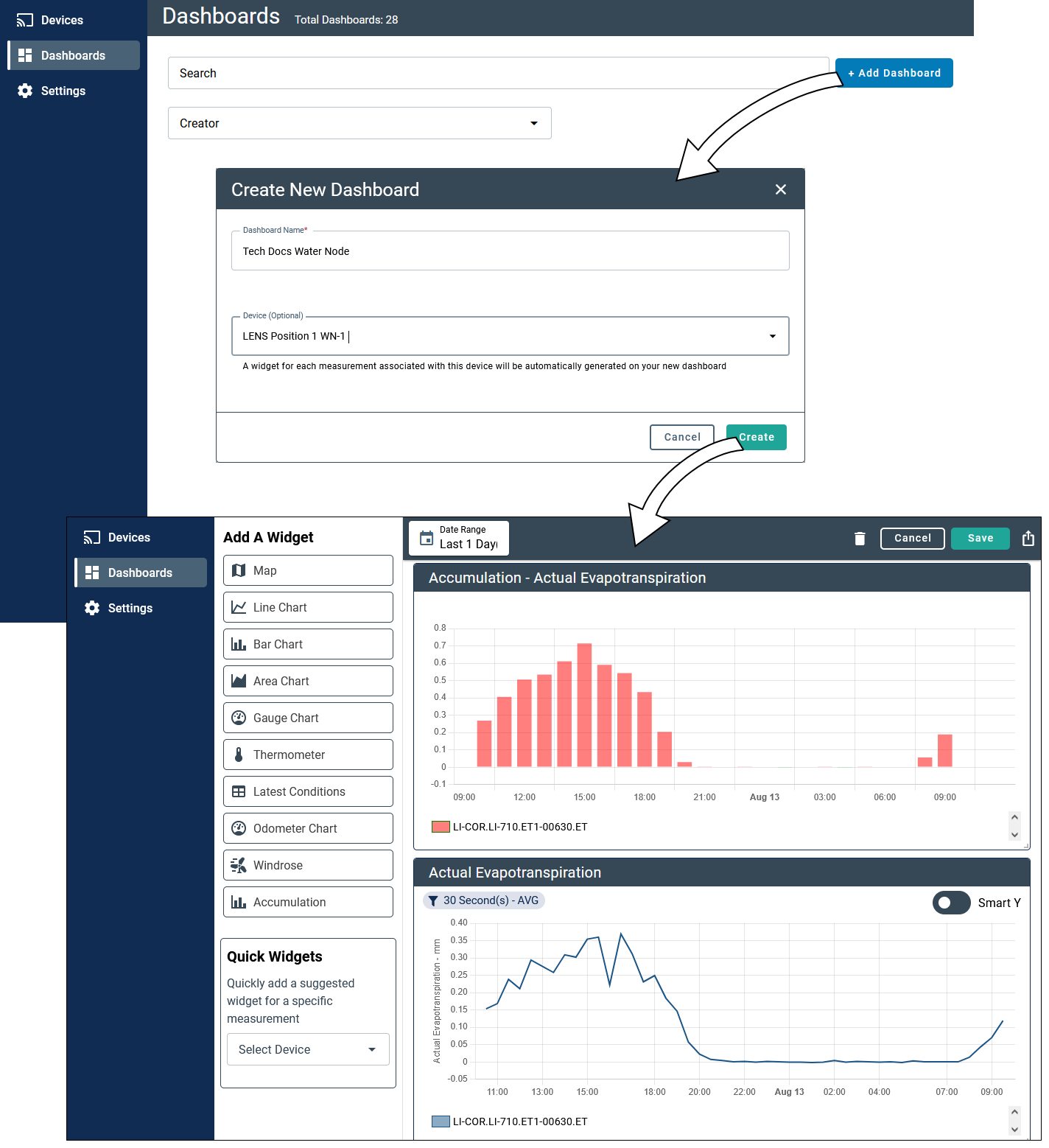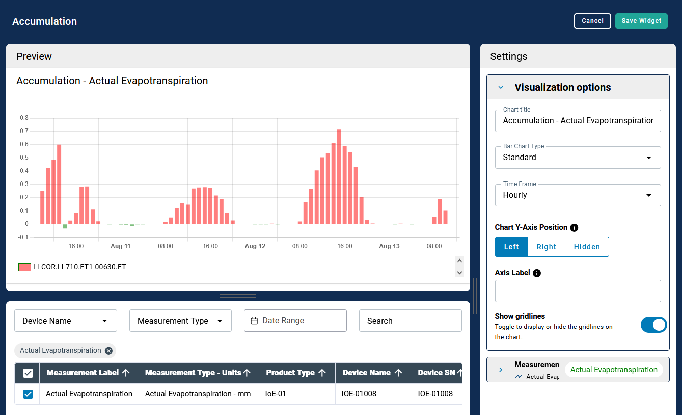 Widgets relevant to Water Nodes will be added automatically after you select a Water Node, including the Evapotranspiration Line Chart and the Accumulation widgets, among others.