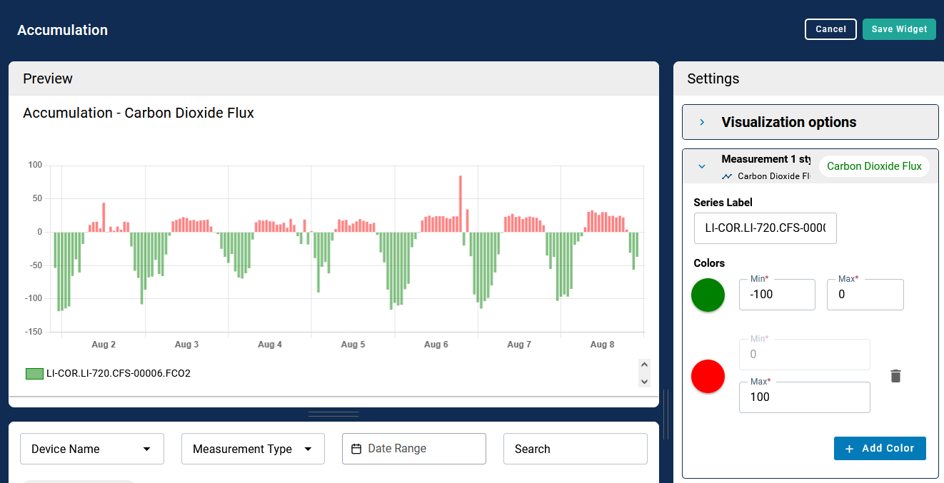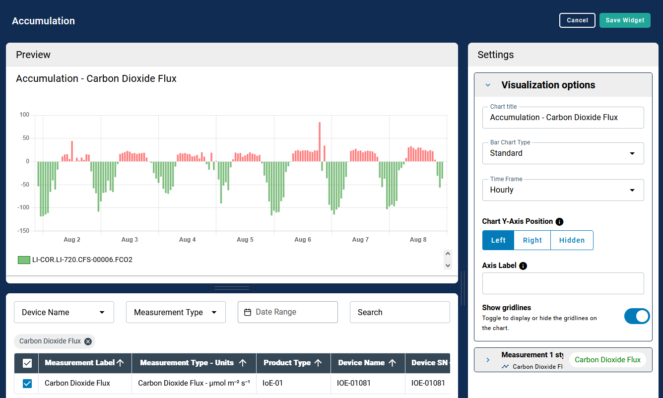 To view data from an instrument, you will create a Dashboard and add Widgets to it. LI-COR Cloud will show a variety of widgets by default. You can add, move, and re-size widgets to suit your preferences. For Carbon Nodes, two widgets may be of special interest: accumulation and gap filling.