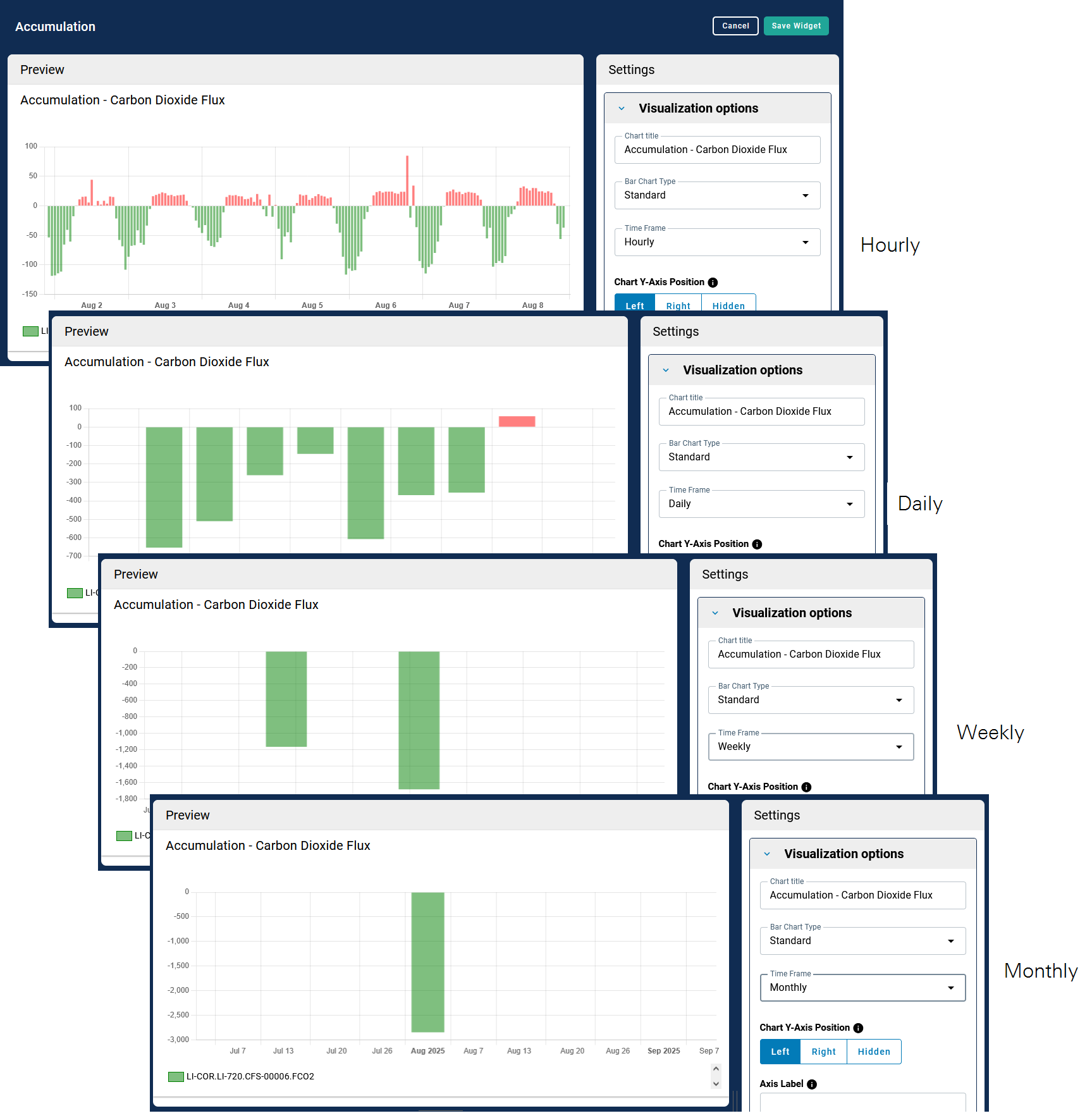 Accumulations can be computed for any variable. A chart of accumulations can show data from different instruments and parameters in the group. This maybe useful for comparison of measurements from multiple sensors or sites of different parameters that help interpret the data. To set up an accumulation widget: