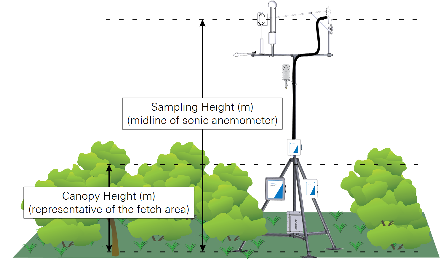 - Vertical Separation (cm): Distance between the anemometer midline and the gas analyzer air inlet. Positive value if the inlet is above the anemometer midline; negative value if the inlet is below the anemometer midline.