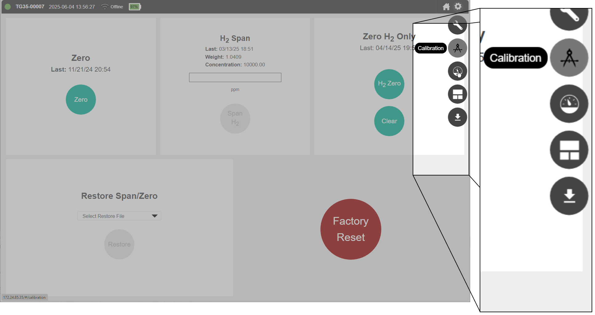 Zero gives the date of the most recent zero calibration. See Instrument calibration for details on the Zero button.
