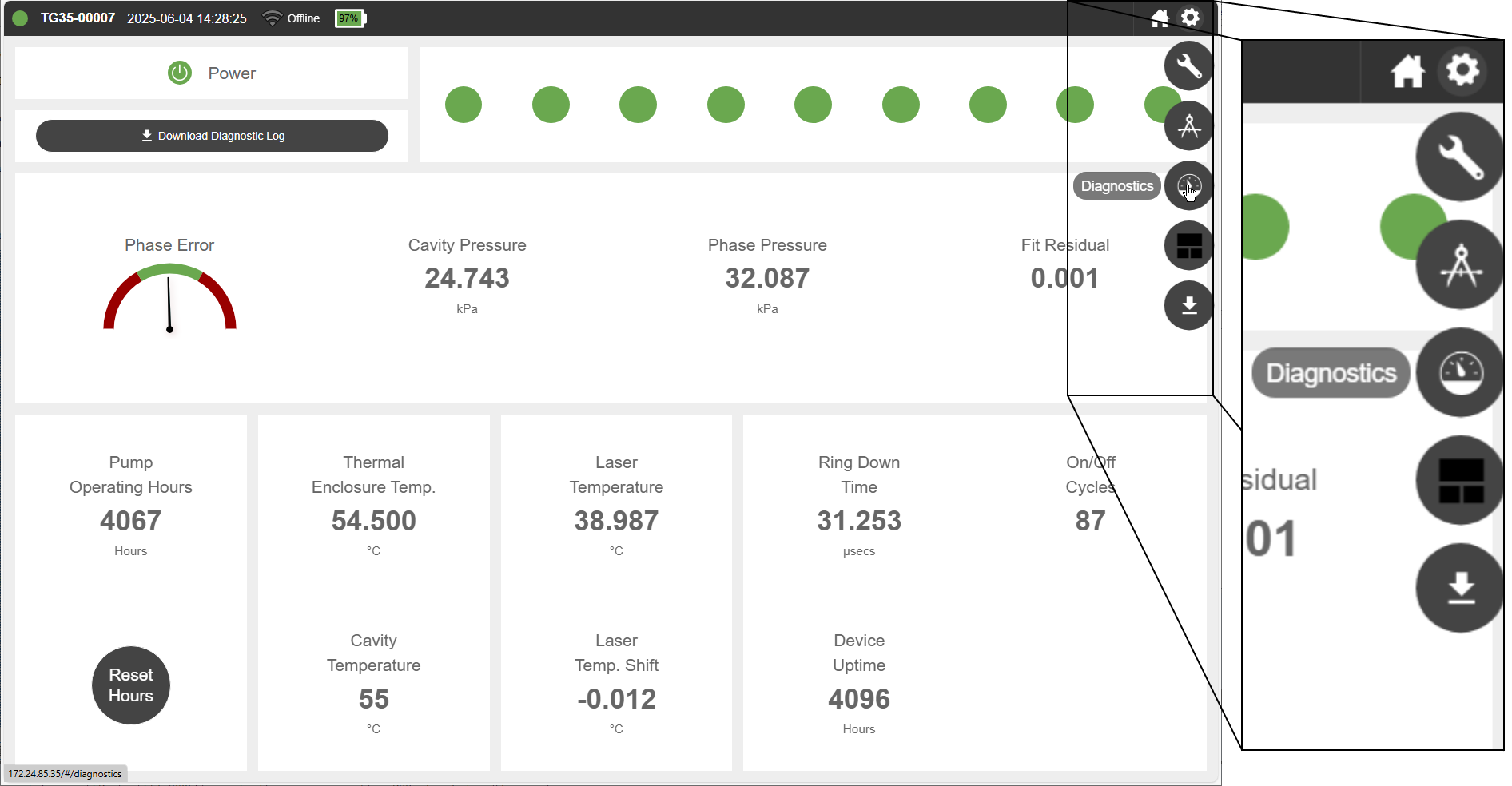 In the upper right, nine bubbles provide more detailed status information. Normal operation is indicated by green bubbles. An exclamation point inside one or more bubbles indicates that the instrument is not in a normal operating state. Typically these are displayed when the instrument is warming up, and the status message will disappear when the warmup is completed. Click a bubble to view the status message. See Status codes for more information. If your instrument is displaying warnings that do not resolve themselves over the course of a few hours or by restarting, contact technical support.