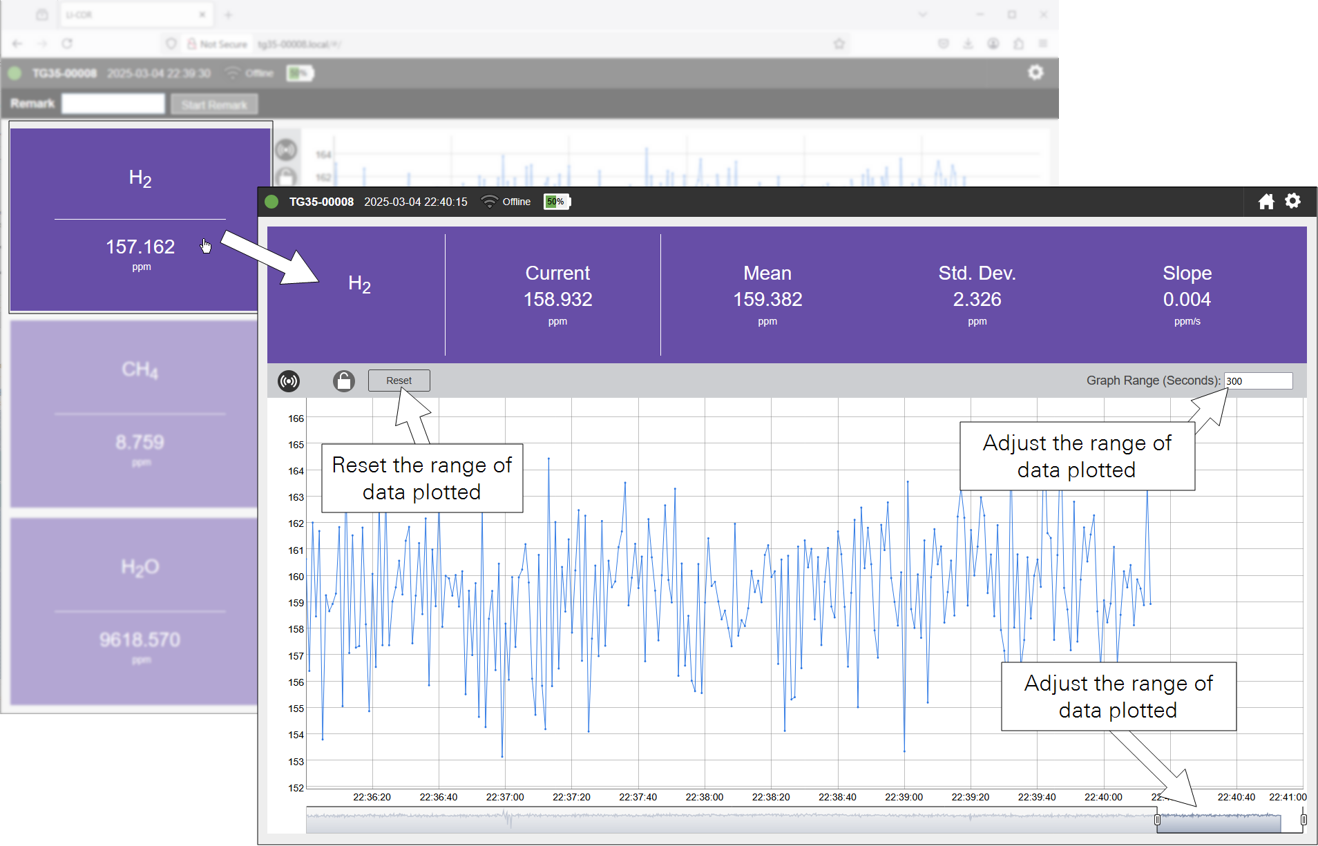 In the graphs, you can click and drag to zoom in and reset the zoom by double-clicking the graph. For any gas, you can click the rectangular panel to view more details, including the current measurement, mean, standard deviation, and slope for the displayed time range. You can adjust the plotted time range with a slider or by typing in the number of seconds in Graph Range (Seconds). Click Reset to restore the default range of 300 seconds.