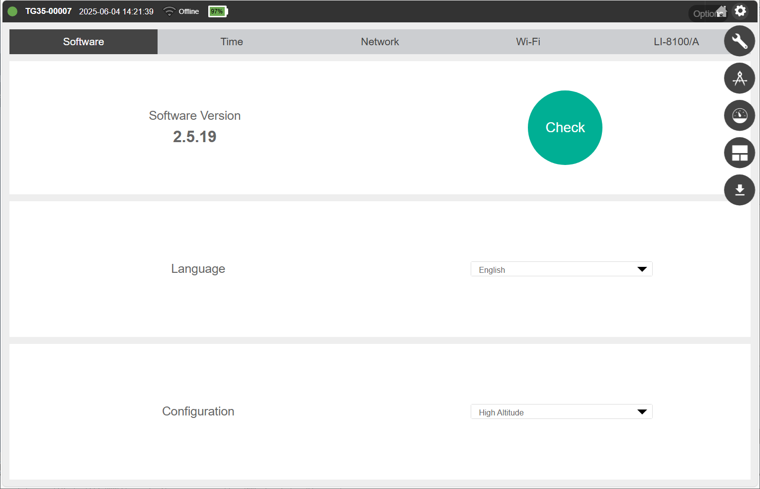 Under Settings > Software, you can check the software version, check for updates, and change the language setting. Click Check to check for software updates. The instrument must be online to check. See Software updates for update instructions.