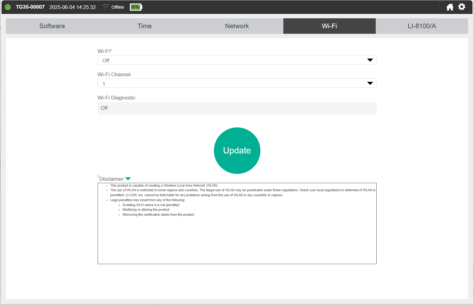 When Wi-Fi is on, the instrument will create a local network that is not connected to the global internet. You should see the network on the list of available networks. The network name is the same as the instrument serial number. If you change the settings, click Update to apply them. You can also choose a channel for communication over the wireless network. When there are many Wi-Fi networks available in one location, you can assign a specific channel for a more reliable connection.