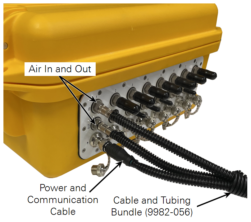 Extension manifolds connect to the multiplexer with the cable and tube bundle (part number 9982-056). The multiplexer provides power to the extension manifold and to any Long-Term Chambers connected to the extension manifold (unless you are using the flask sampling kit). The multiplexer and extension manifold use quick-connect fittings for air tubes and connectors for the cables.