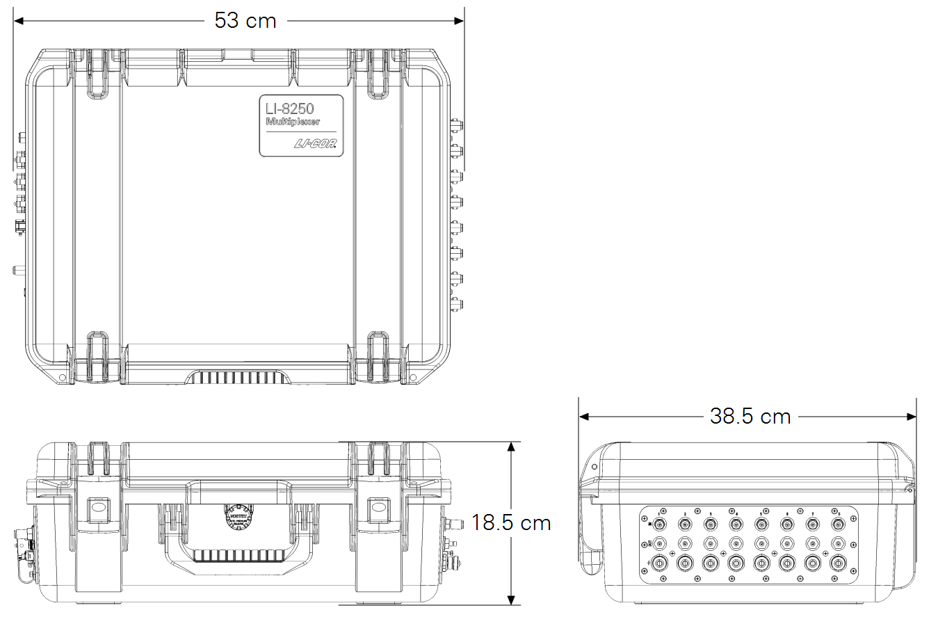 Three sealed and strain-relieved RJ-45 Ethernet: For connection to LI-COR LI-78xx Trace Gas Analyzers, network, or cellular modem. Connectors also accept standard, non-sealed RJ-45 Ethernet cables for lab use.