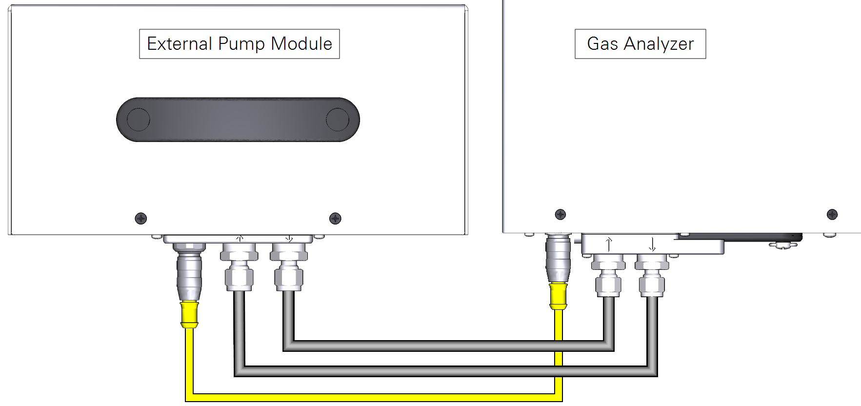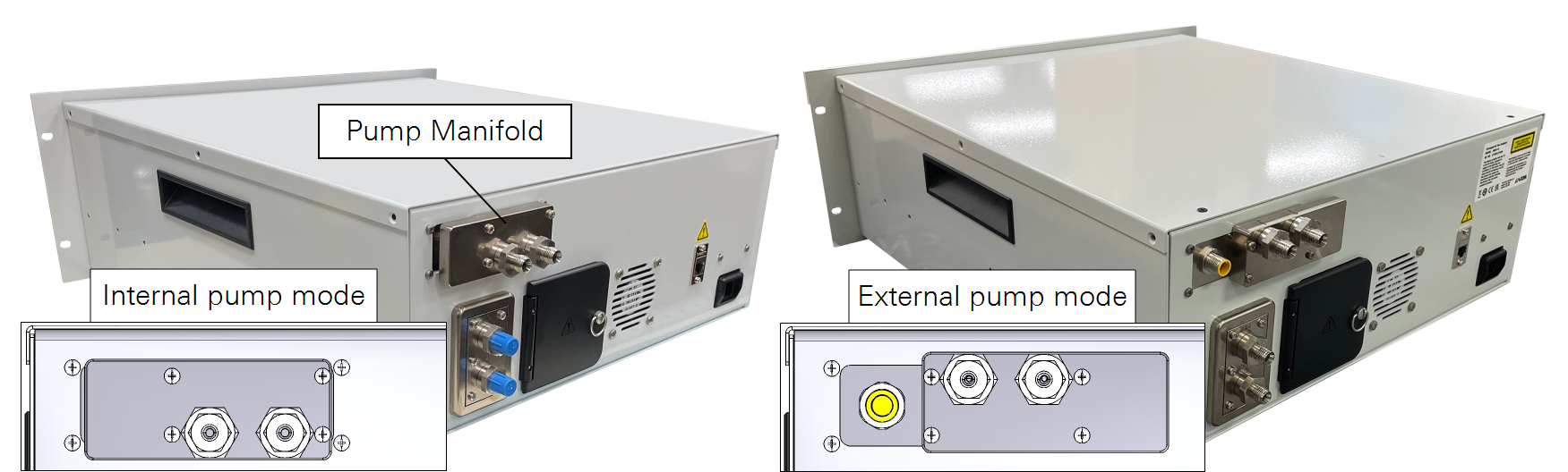 Remove the four screws that secure the manifold. Turn the manifold 180° and install the four screws. This exposes the connector and modifies the flow routing, directing flow through the external pump instead of the internal pump.