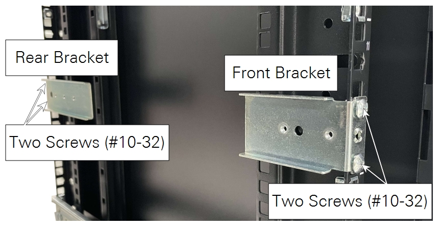 Figure 2‑1. Rails attach to the rack with brackets and screws at the front (left) and back (right). Instrument racks vary; install the rails using the best method for your rack. -