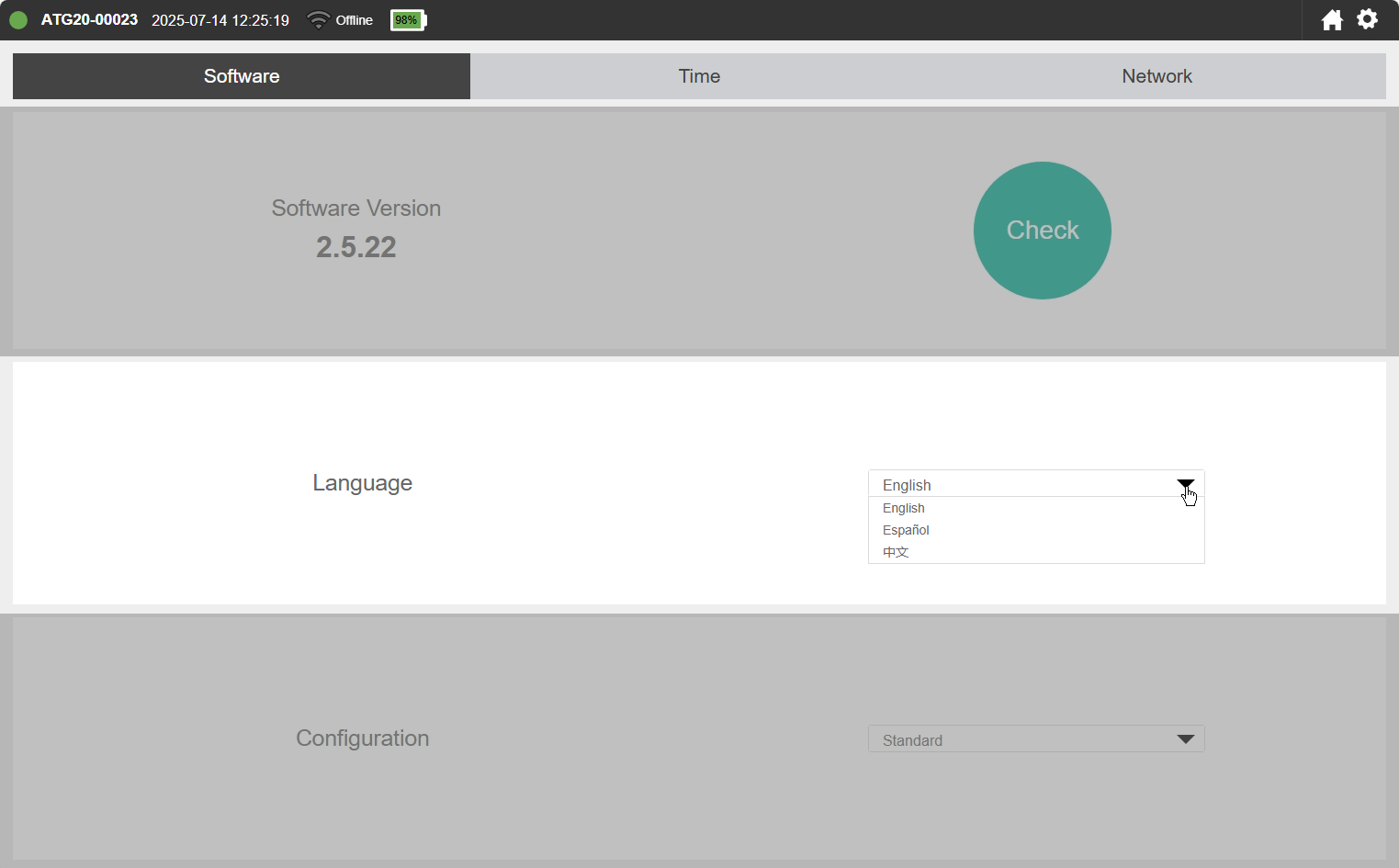 The interface can be displayed in English, Spanish, and Simplified Chinese. If you need to change the language setting, click Options > Settings. The language setting is stored in the web browser. Any time you connect with a browser for the first time or clear your browser cache, the language setting will be in the default state (English).