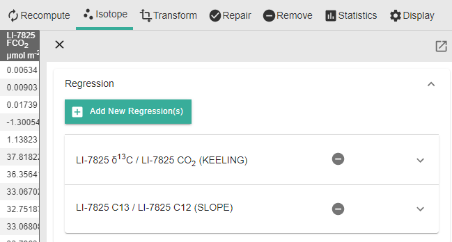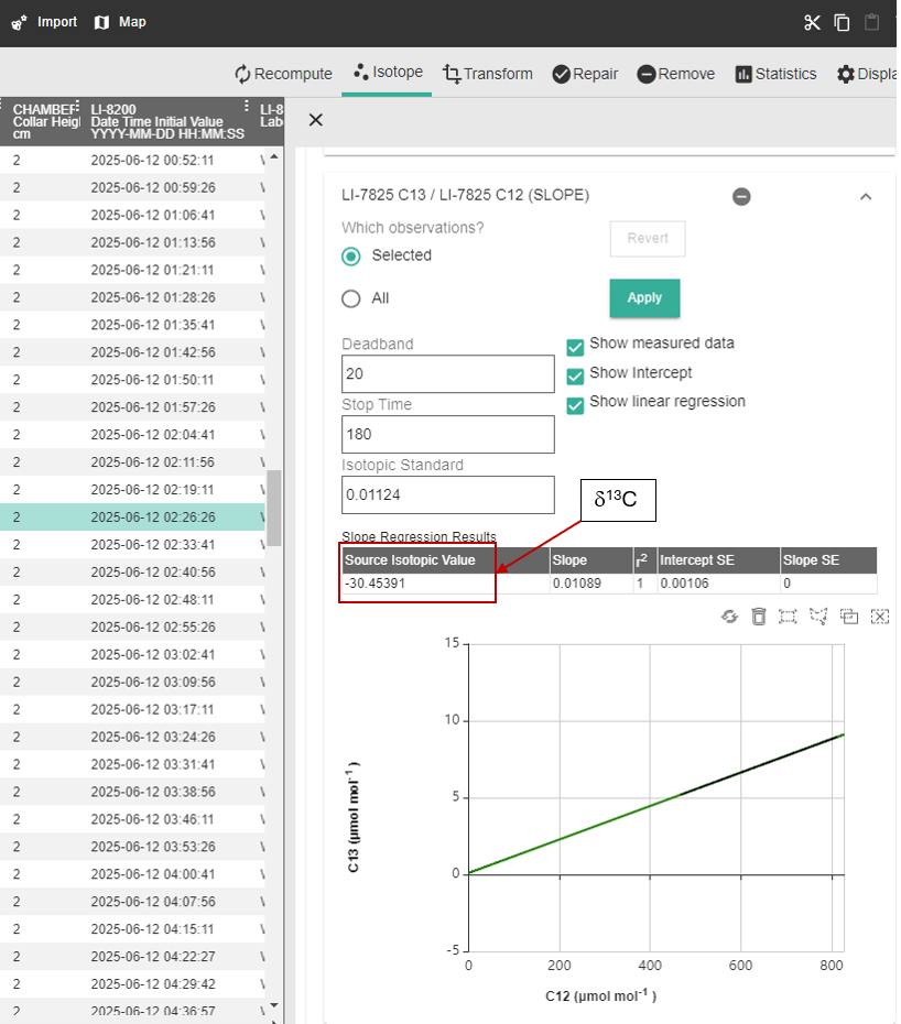 For Slope Regression, select LI-7825-C13 (13CO2) as the Minor gas source, and LI-7825-C12 (12CO2) as the Major gas source.
