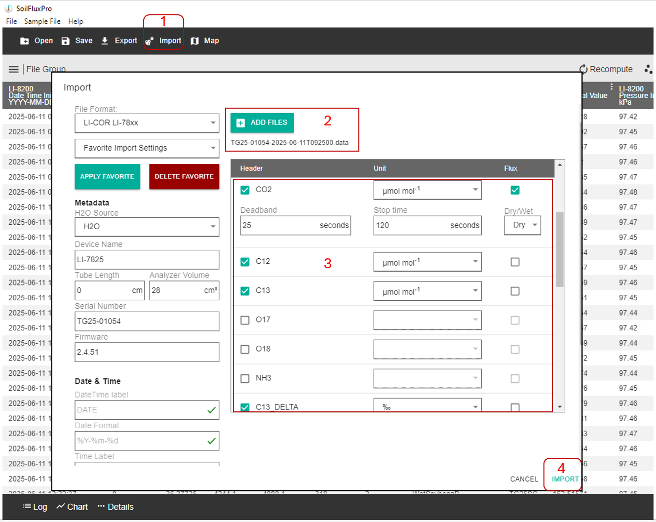 Open the Smart Chamber data file (*.json) with SoilFluxPro Software (SFP), then follow the steps described below to import the carbon isotope gas concentration data from LI-7825 (Figure 4).