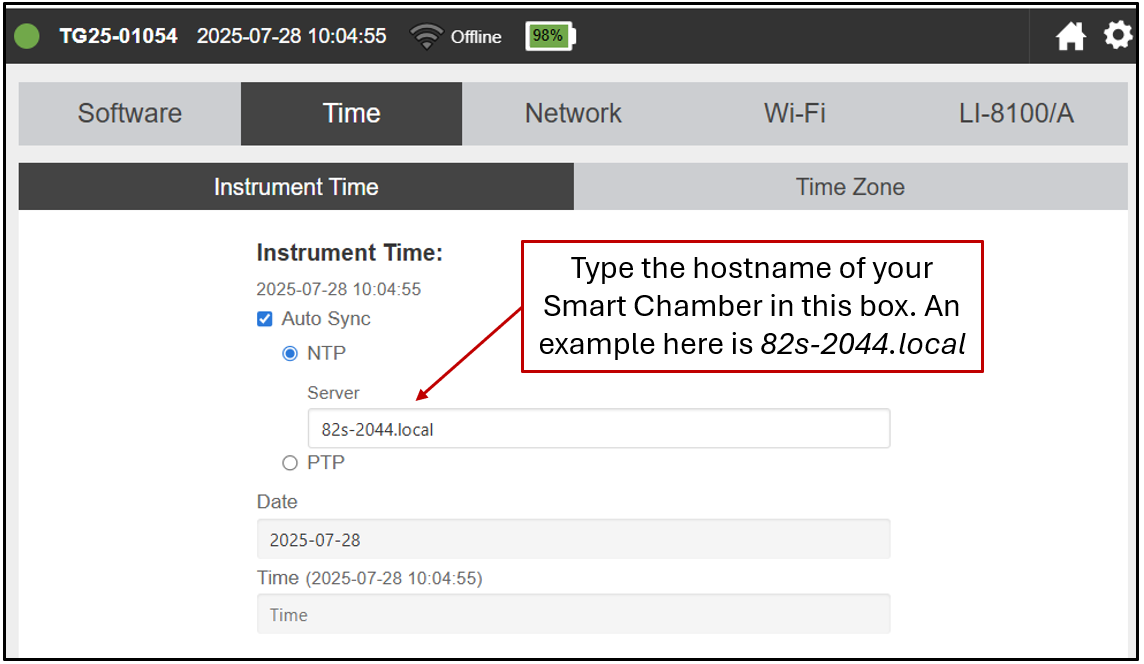 Ensure that the LI-7825 and Smart Chamber are connected using the provided Ethernet cable and tubing bundle. Make sure the two instruments clocks are set to use the same time zone. Then, on the Time setting in your LI-7825 interface, check Auto Sync, select NTP, and then specify the hostname of your Smart Chamber (e.g. 82s-2044.local) as the time server (see Figure 3). The clocks on the instruments should synchronize in about 2-3 minutes after setting the Smart Chamber as the NTP server for the LI-7825.